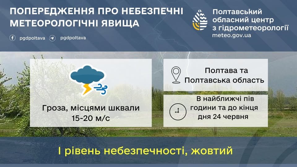 За повідомленням Полтавського обласного центру з гідрометеорології до кінця 24 червня на території Полтавської області очікуються грози, місцями шквали 15-20 м/с. Оголосили І рівень небезпечності – жовтий.