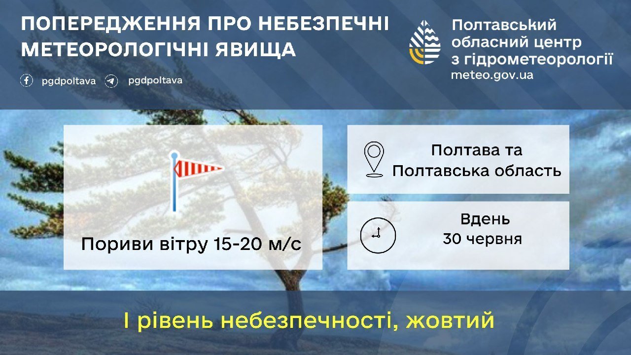 Полтавський обласний центр з гідрометеорології попереджає про небезпечні метеорологічні явища. Вдень 30 червня на території Полтавської області очікуються сильні пориви вітру — до 15-20 м/с.