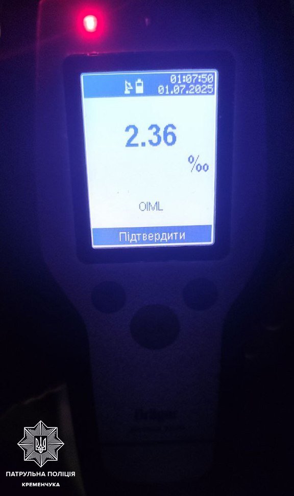 Під час перевірки на місці драгер показав 2,36 проміле алкоголю — це майже у 12 разів більше за допустиму норму (0,2 проміле).