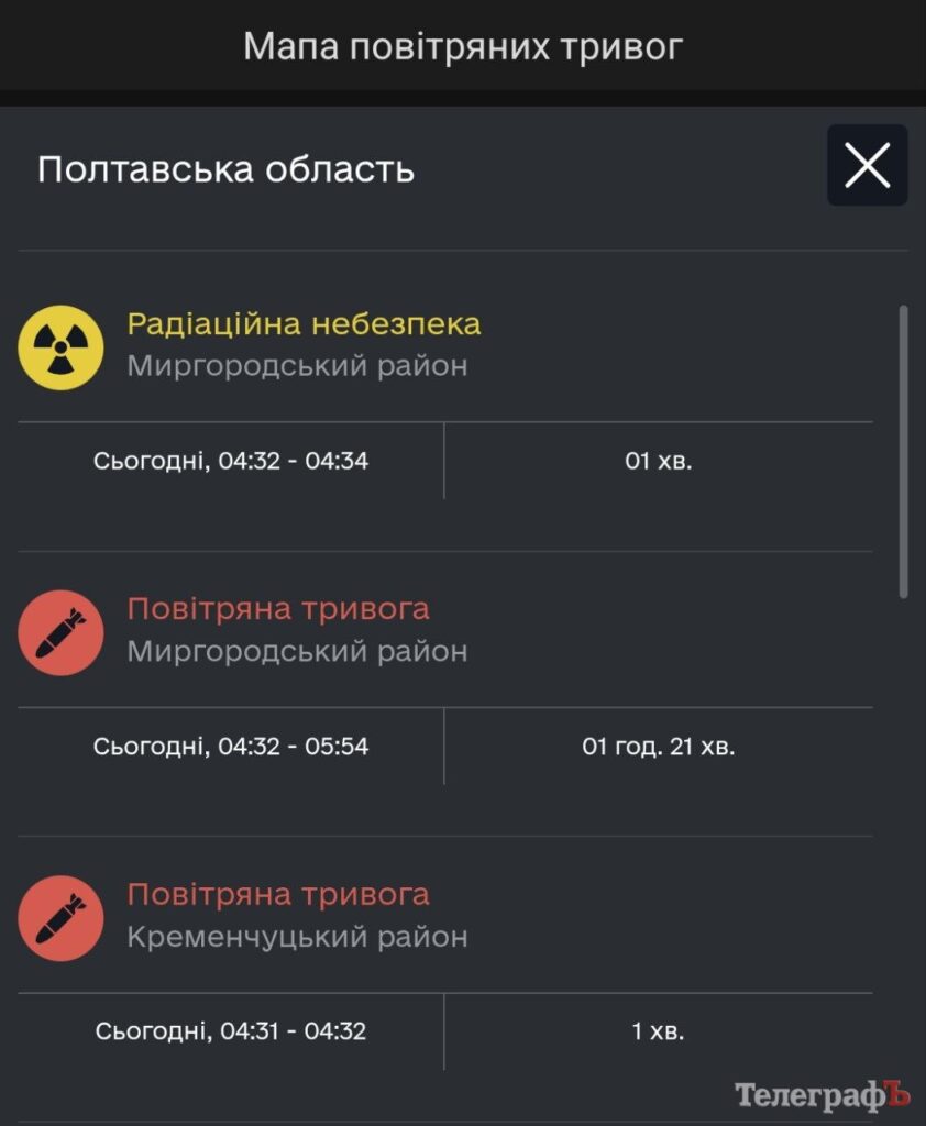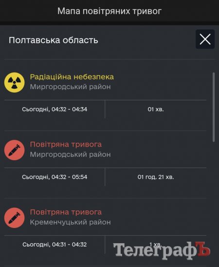 Сама ж повітряна тривога у Миргородському районі тривала з 4.32 до 5.54, у Кременчуцькому — лише одну хвилину (4.31–4.32).