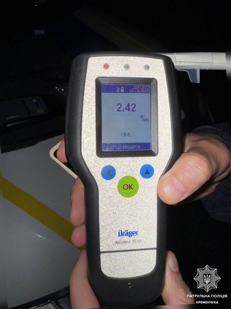 Під час огляду керманич Opel мав явні ознаки алкогольного сп’яніння. Результат — 2,42 проміле, що вказує на значне перевищення допустимої норми.