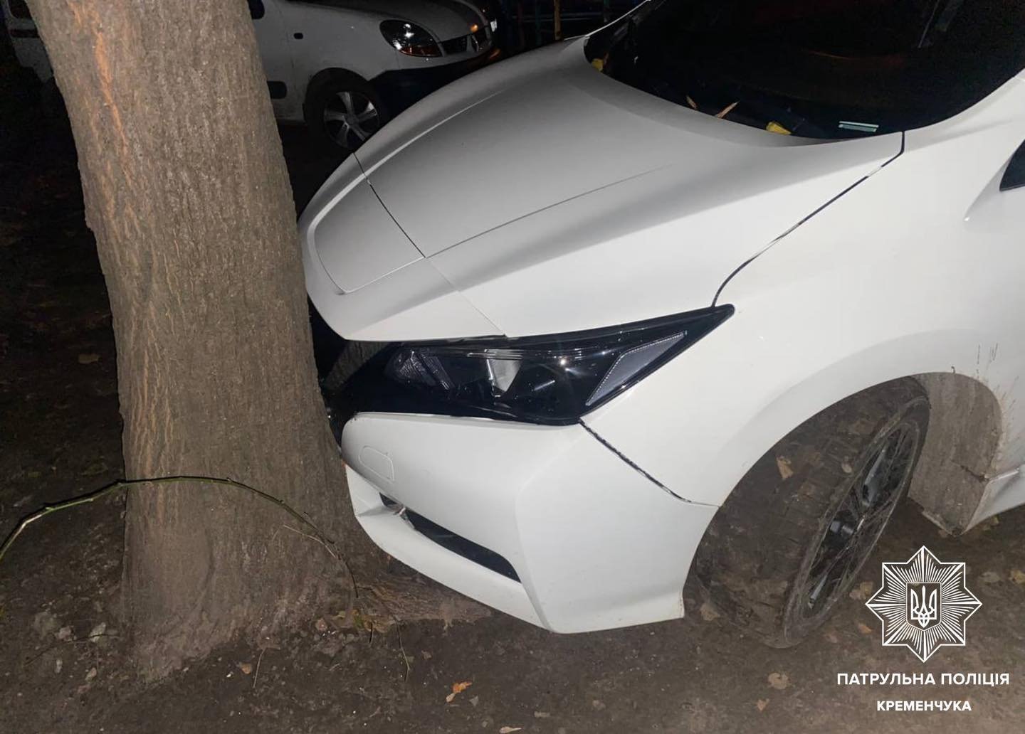 У суботу, 15 листопада, ввечері патрульна поліція отримала повідомлення про дорожньо-транспортну пригоду на вулиці Перемоги у Кременчуці. Під час з’ясування обставин ДТП патрульні встановили, що водій автомобіля Nissan перед початком руху не впевнився у безпечності маневру та зіткнувся з припаркованим автомобілем Suzuki, а потім — з деревом. Про це повідомила пресслужба Патрульної поліції Кременчука.
