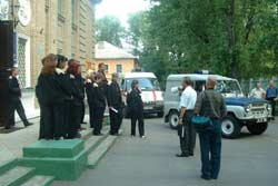 Людей під час навчальної евакуації на автобусі відвезли до збірно-евакуаційного пункту, що розмістився в четвертому корпусі КІДУЕП. Працівники підприємства реєструвалися та гуртувалися біля адміністраторів. В супроводі міліціонера колони відправилися далі.