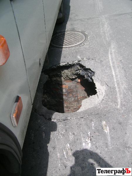 На асфальте видны чёткие следы от кузовов автомобилей, попавших в эту яму.