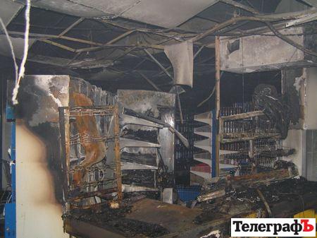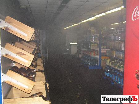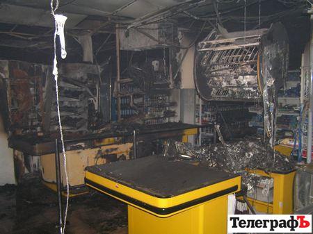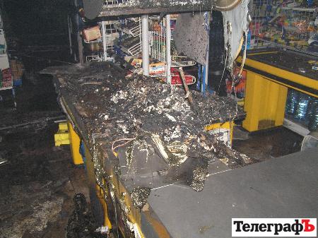 Огнем уничтожено 2 кассовых аппарата, 2 транспортных ленты, холодильная камера, кофейный аппарат, аппарат для оплаты сотовой связи, подвесной потолок на площади 15 кв м, повреждено остекление, продукты питания и промтовары.