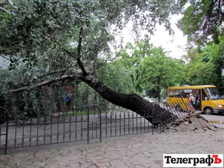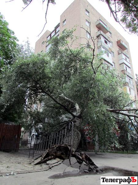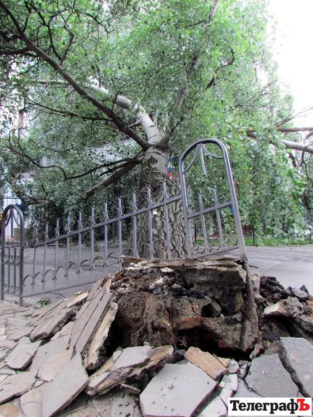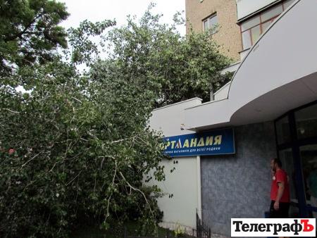 В центре Кременчуга, в районе перекрёстка улиц Октябрьской и Пролетарской огромный тополь упал на тротуар. ЧП произошло утром 6 июля. Верхней частью кроны дерево завалилось на магазин «Спортландия».