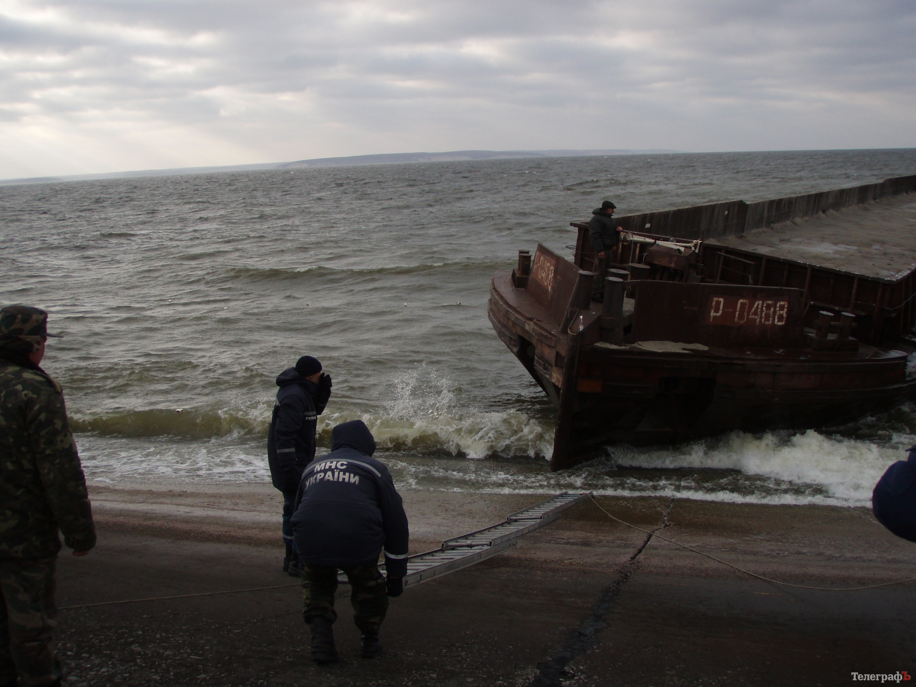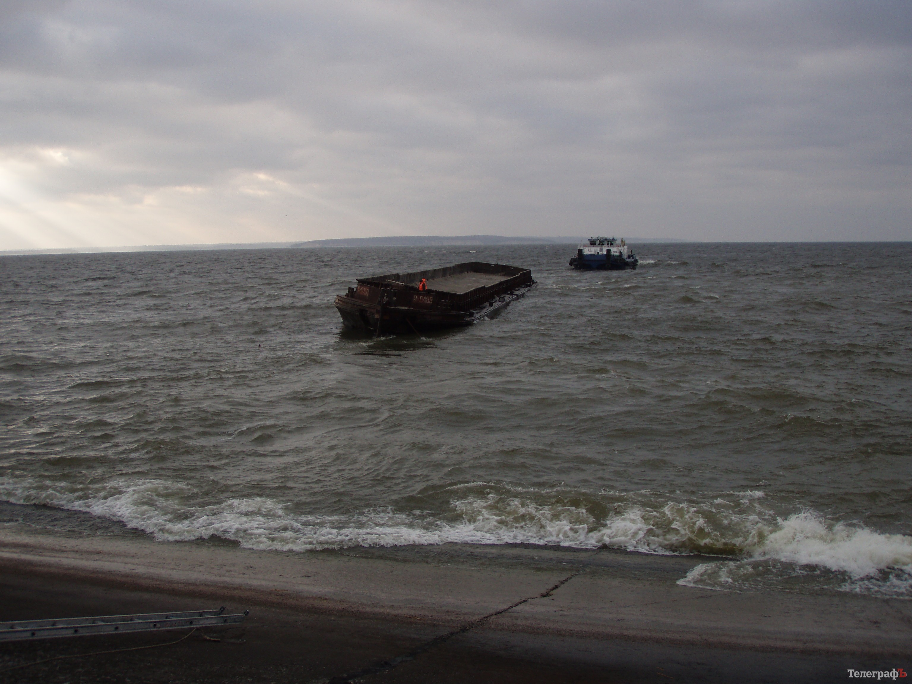 Под дамбой Кременчугской ГЭС «ловят» оторвавшуюся во время шторма баржу