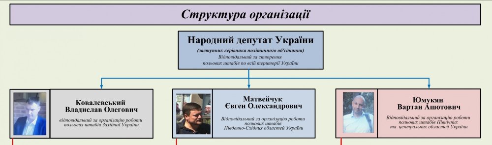 Реалізація проекту передбачала формування у виборчих округах так званої «піраміди»: керівник сектору – старший виборчої дільниці – «десятки» – «двадцятки», які повинні забезпечити необхідну кількість голосів на користь конкретного кандидата. СБУ встановила, що основним координатором цієї мережі є один із діючих народних депутатів України.