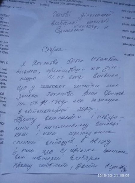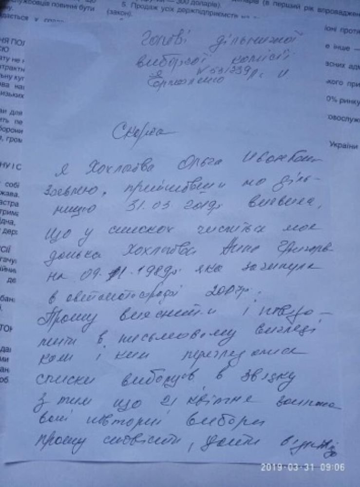 Полтавка, показавши документи членам ДВК при отриманні бюлетеня, побачила у виборчих списках доньку, яка загинула 12 років тому. За словами жінки, це вже не перший раз її загибла донька значиться у виборчих списках. Полтавка написала скаргу голові виборчої дільниці, у якій просила надати їй інформацію в письмовому вигляді щодо того, хто формував списки виборців. Адже це важливо напередодні другого туру виборів, який ймовірно відбудеться 21 квітня 2019 року.
