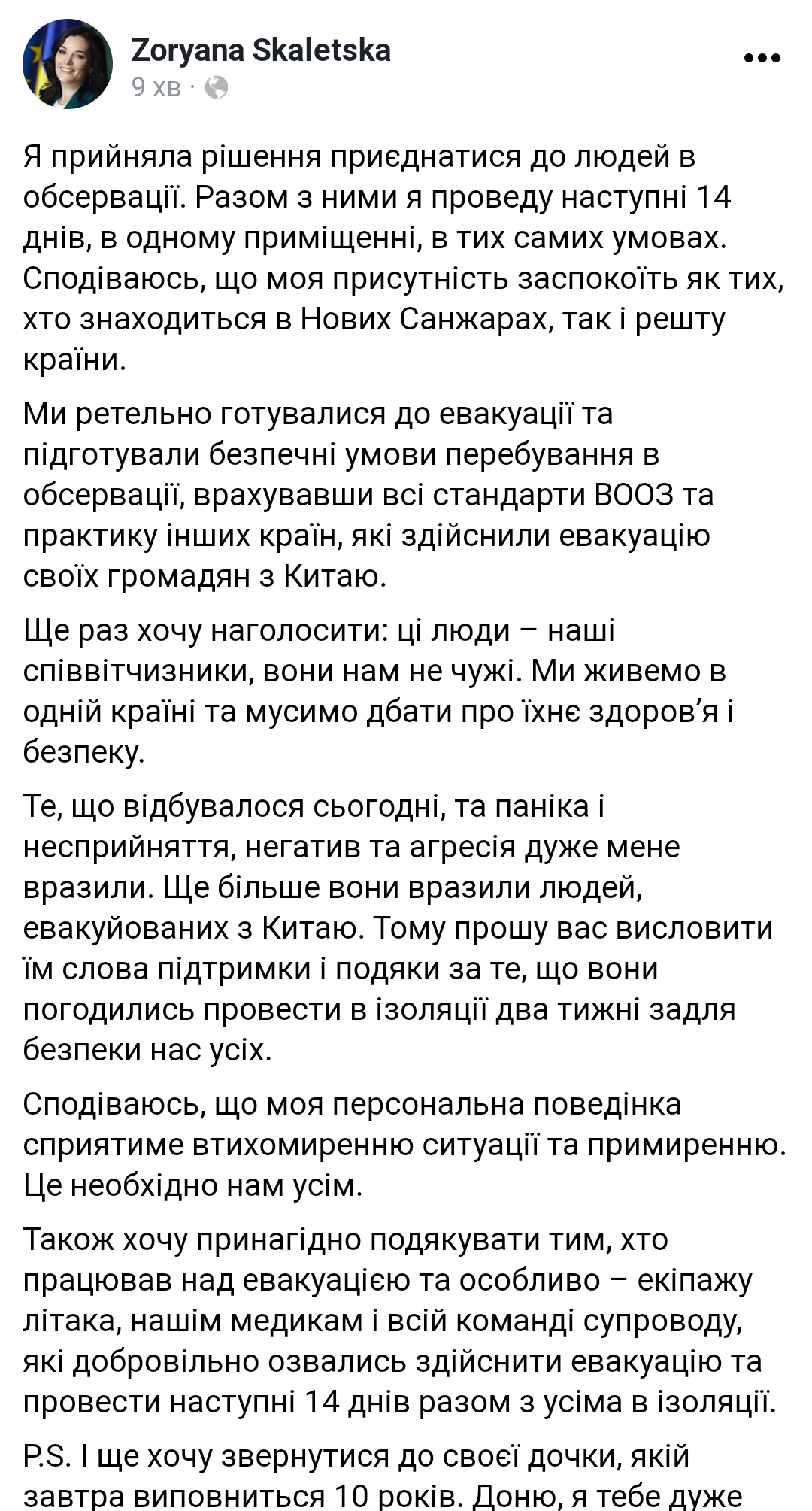 Сьогодні увечері, 20 лютого, міністр охорони здоров'я України Зоряна Скалецька заявила на власній сторінці у фейсбуці, що проведе 14 днів обсервації разом з евакуйованими українцями в Нових Санжарах.