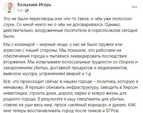 У Херсон зайшли російські окупанти. Мер Міста Ігор Колихаєв стверджує, що над містом майорить український прапор, і йому доводиться виконувати низку вимог, які йому поставили, щоб так і залишалось. Про це він написав на своїй сторінці у фейсбуці, наголошуючи, що це не були переговори, але був візит до міськради «озброєних відвідувачів».