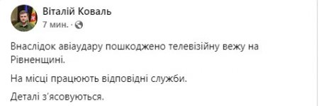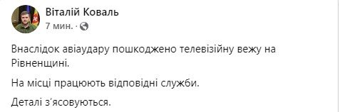 7.02. Стало відомо, що внаслідок авіаудару пошкоджено телевізійну вежу на Рівненщині. Деталі з‘ясовуються. Про це повідомив у фейсбуці начальник Рівненської ОВА Віталій Коваль.