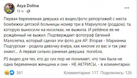 Одна з вагітних жінок, які постраждали в Маріуполі від авіаудару по пологовому будинку, померла разом із ненародженою дитиною. Це та жінка, яку виносили на ношах. Про це написала журналістка «Голосу Америки» Ася Доліна у фейсбуці.