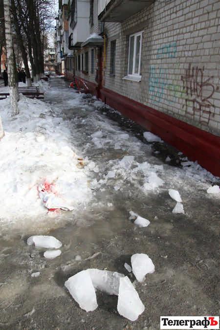 Трагедія сталася 23 лютого на вулиці Шевченка, 34/2. Дві подруги проходили повз будинок, коли на них та ще одного перехожого з даху звалилася льодяна брила. Вона проломила жінці голову – на снігу залишилася кривава пляма. Потерпіла у лікарні. Міліція перевіряє, чому лід опинився на голові громадянки. Будинок, на якому «визрівала» брила, належить ОСББ. Його власники кажуть, що попереджувальні стрічки почепили, але на збивання льоду грошей немає…