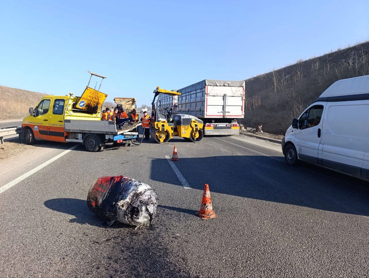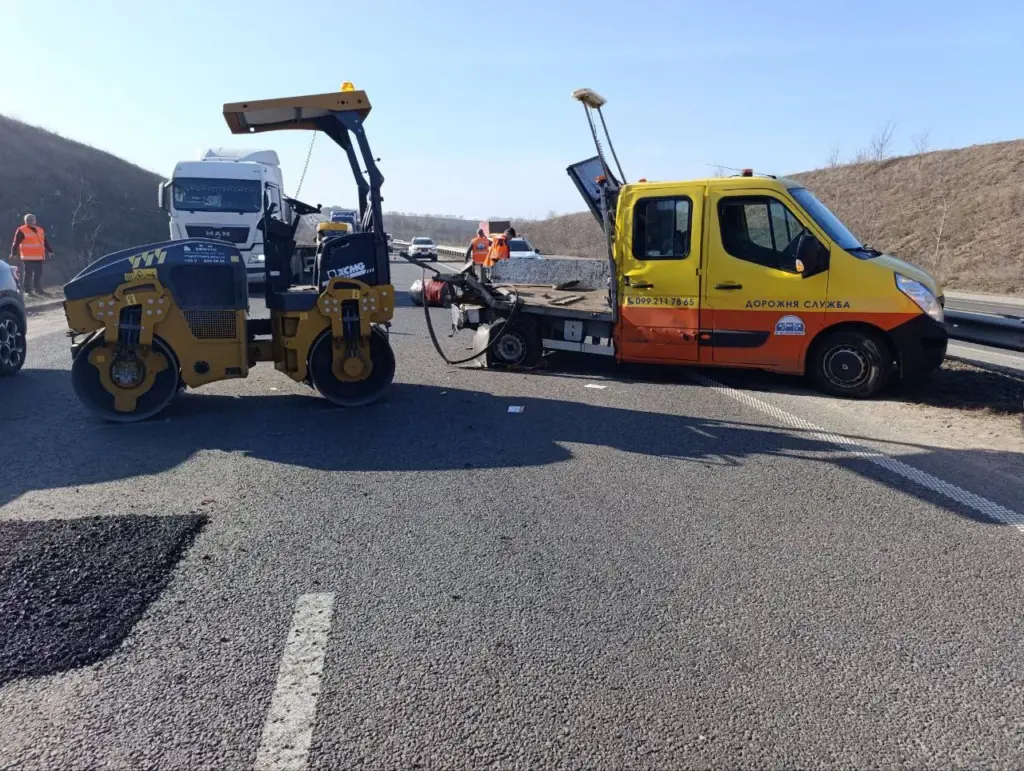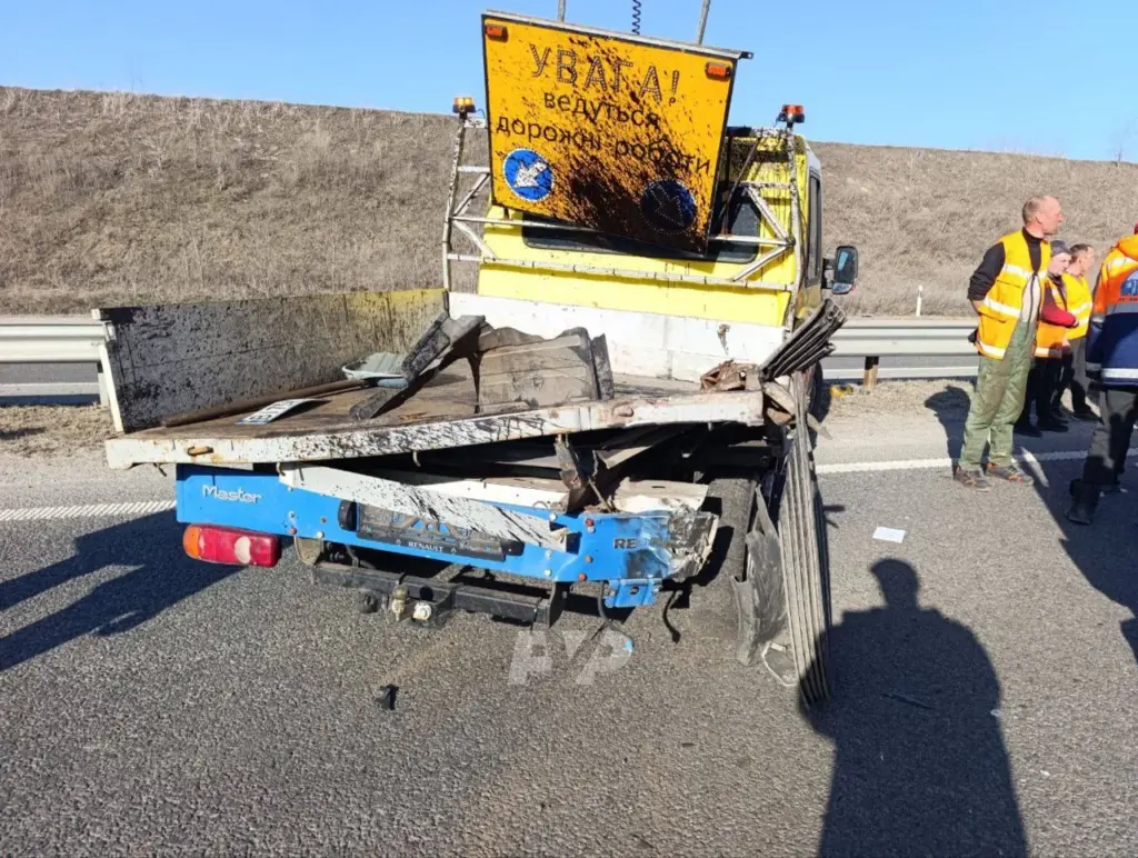 Ймовірно, тягач не помітив попереджувальні знаки про ремонт дорожнього покриття та врізався у техніку дорожньої служби.