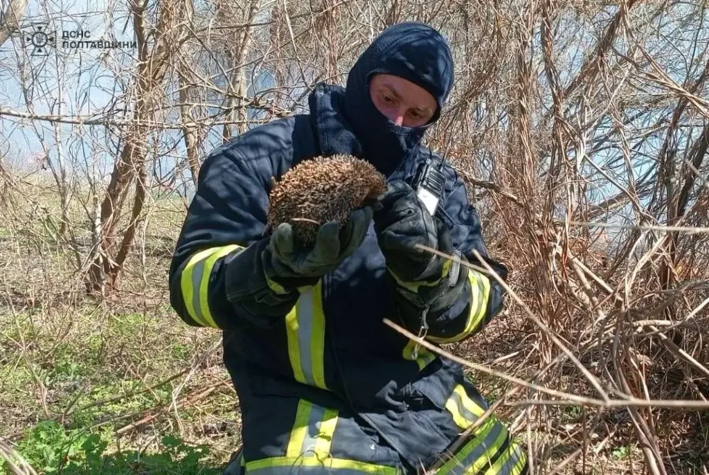 Під час гасіння вогню надзвичайники врятували їжака, який опинився у палаючій траві. Тварину винесли у безпечне місце.