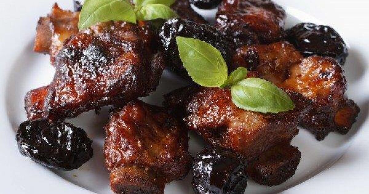 - Ребра перекласти в каструлю, залити водою, додати кетчуп, соєвий соус, мед, чорнослив, поставити тушкуватися на 1 годину на повільному вогні.