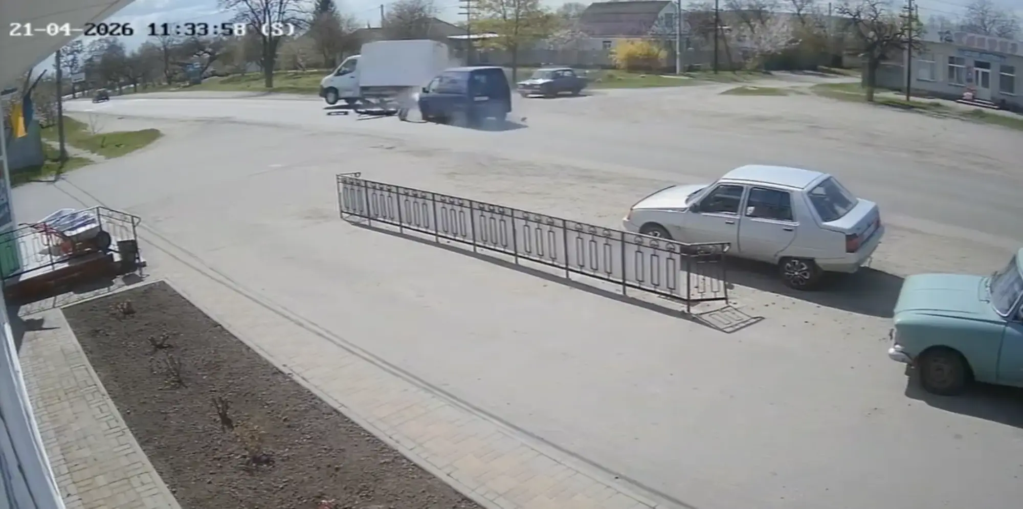 На відео з камер спостереження видно, як мікроавтобус виїжджає з парковки на перехрестя, після чого в нього на великій швидкості врізається вантажівка. Від удару вантажівка перекинулася на бік.