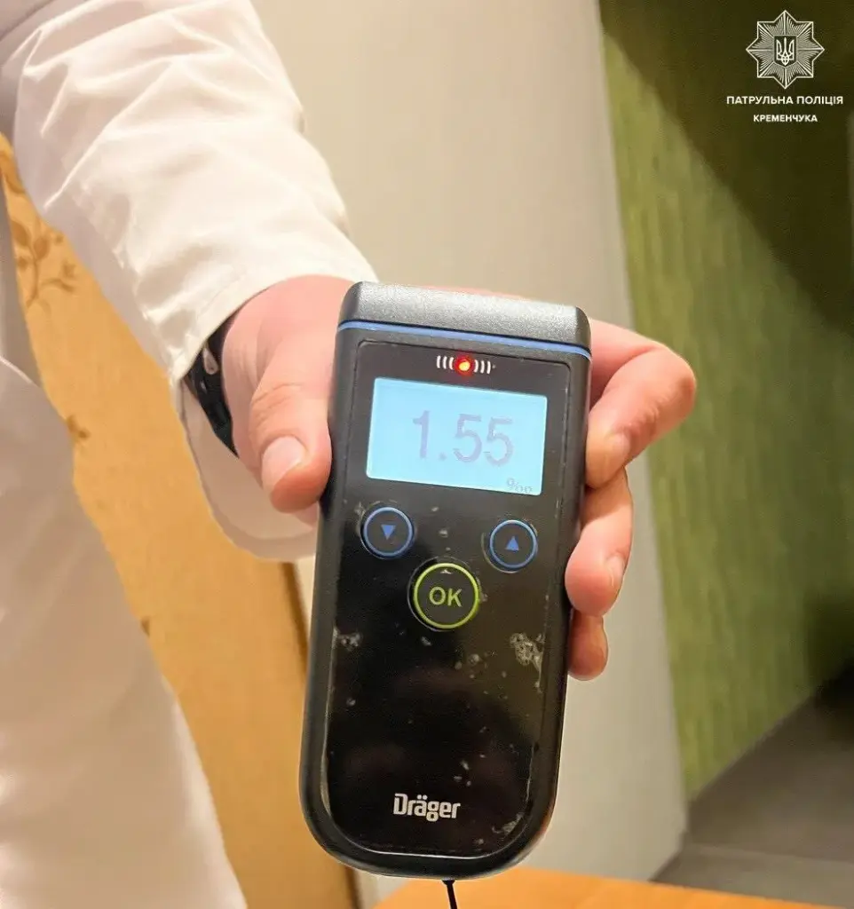 У медичному закладі чоловік пройшов огляд за допомогою приладу «Драгер». Результат — 1,55 проміле, що майже у 8 разів перевищує допустиму норму (0,2 проміле).