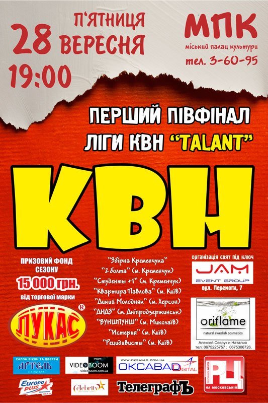 Билеты на концерты, представления и популярные вечеринки в городе «Кременчугский Телеграф» разыгрывает постоянно — следите за обновлениями на сайте. Нажимайте на кнопку ВЫИГРАЙ БИЛЕТЫ.
