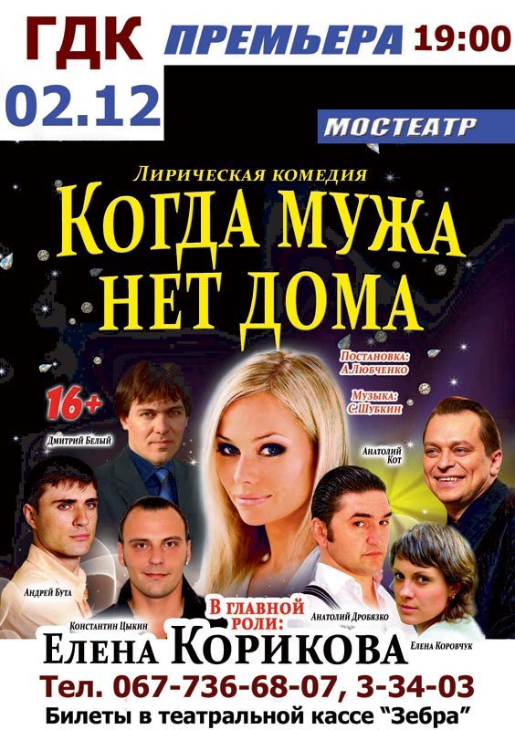 «Кременчугский Телеграф» разыгрывает 14 билетов на спектакль «Когда мужа нет дома». В главной роли – Елена Корикова. Спектакль состоится 2 декабря в ГДК.