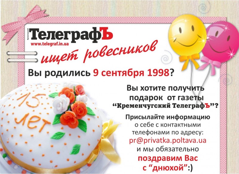 Дорогие ровесники "Телеграфа", присылайте информацию о себе с контактным номером телефона по адресу pr@privatka.poltava.ua