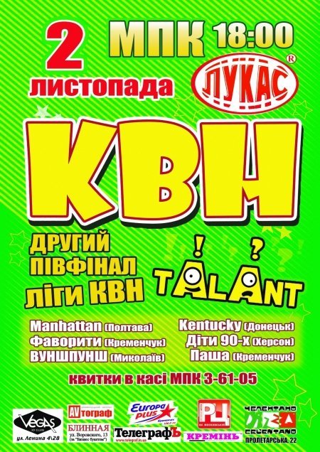 «Кременчугский Телеграф» разыгрывает 10 билетов на второй полуфинал лиги КВН «Талант», который состоится 2 ноября в 18:00 в ГДК. Пять участников розыгрыша получат по 2 билета. Для того, чтобы принять участие в розыгрыше, нужно ответить на вопросы и заполнить анкету. Правильные ответы вы сможете найти на нашем сайте, в новостях.