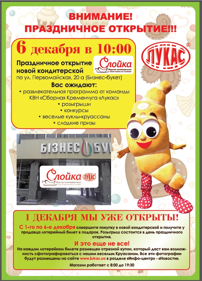 1 декабря открылся фирменный магазин ТМ «Лукас» нового формата - «Кондитерская свежей выпечки и сладостей «СЛОЙКА», расположенный по адресу: ул. Первомайская, д.20а.(ТЦ Бизнес-букет)