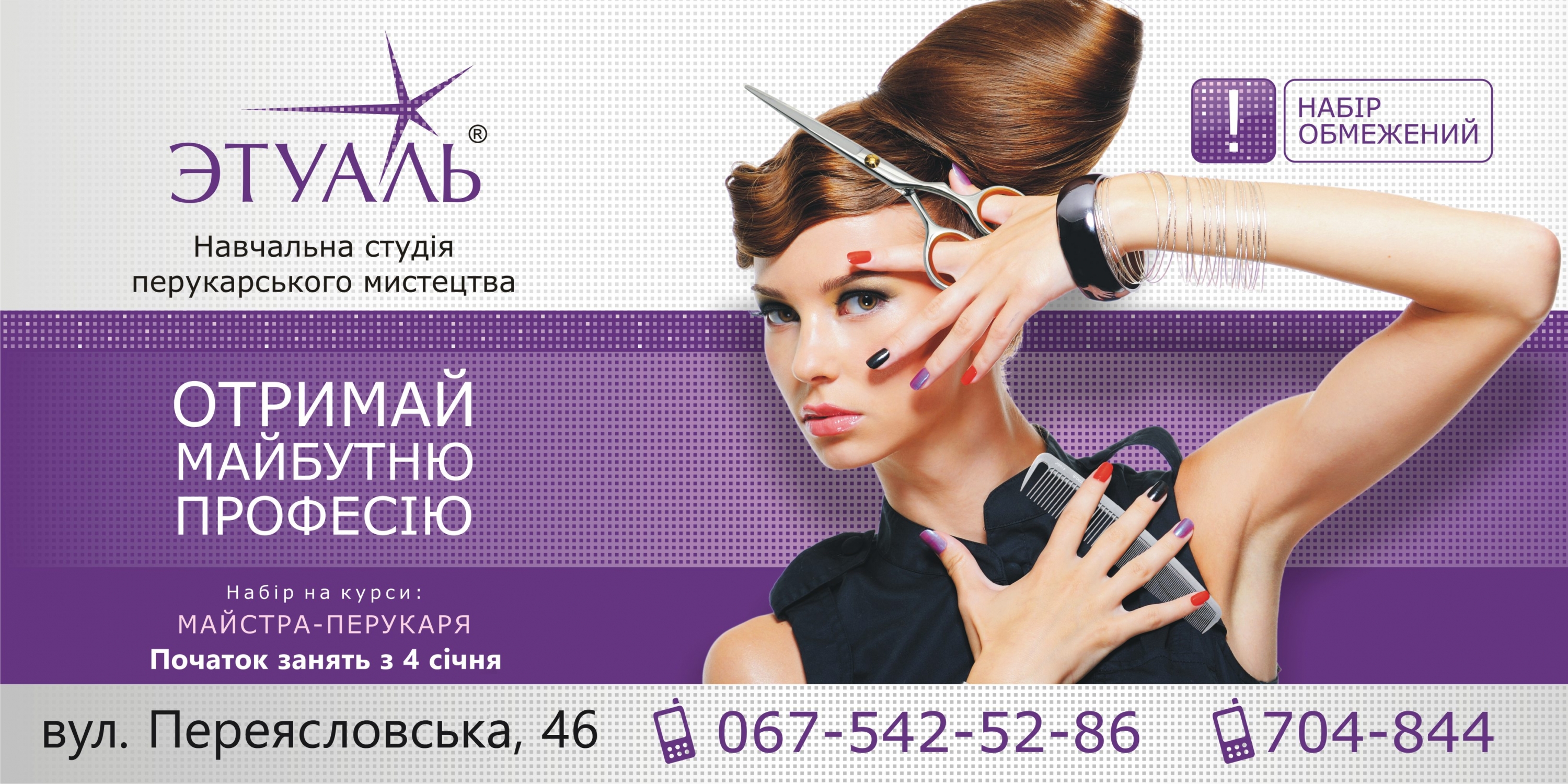 Навчальна студія перукарського мистецтва "Этуаль" продовжує набір на курси майстра-перукаря. Початок занять з 4 січня 2016 р.