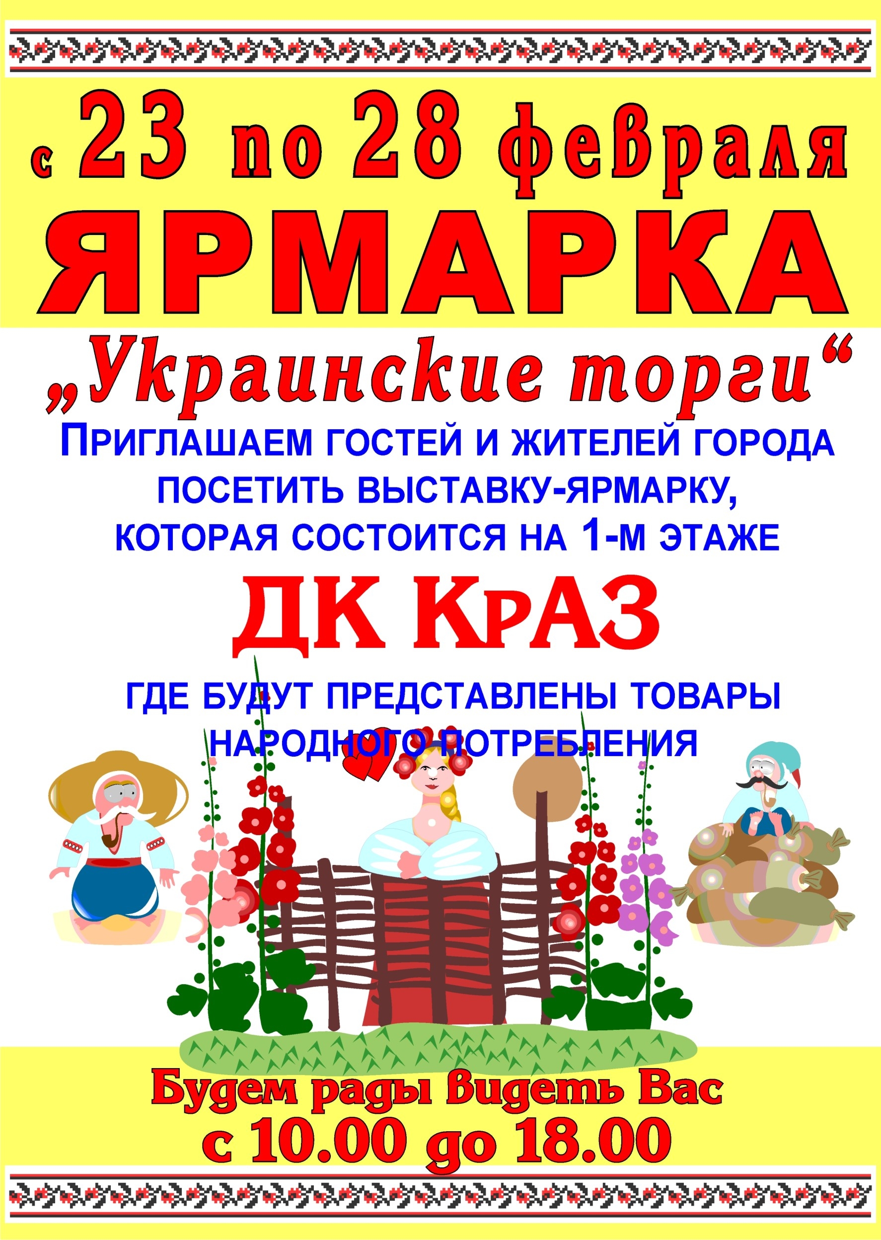 С 23 по 28 февраля приглашаем гостей и жителей Кременчуга посетить выставку-ярмарок «Украинские торги», которая пройдет в ДК КрАЗ на 1 этаже. Здесь вы сможете приобрести товары народного потребления, качественную одежду и обувь. Выставка работает с 23 по 28 февраля с 10.00 до 18.00