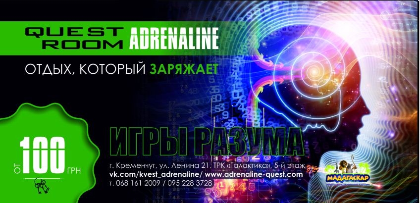 Теперь есть возможность приобрести подарочный сертификат в квест- комнату "Адреналин" для 1 человека! Стоимость сертификата - 100грн.