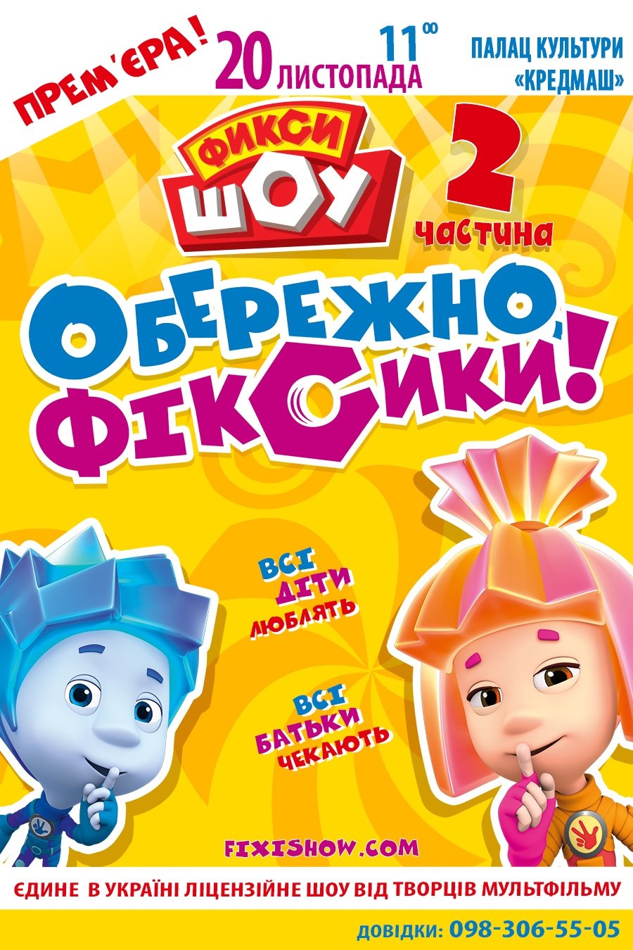 «Фикси ШОУ» — интерактивный спектакль-«хэппенинг», который позволит каждому ребенку принять участие в удивительных приключениях фиксиков прямо во время спектакля. Вы мгновенно схватитесь за планшет или телефон, ведь это — единственное в Украине лицензионное шоу от создателей мультфильма.