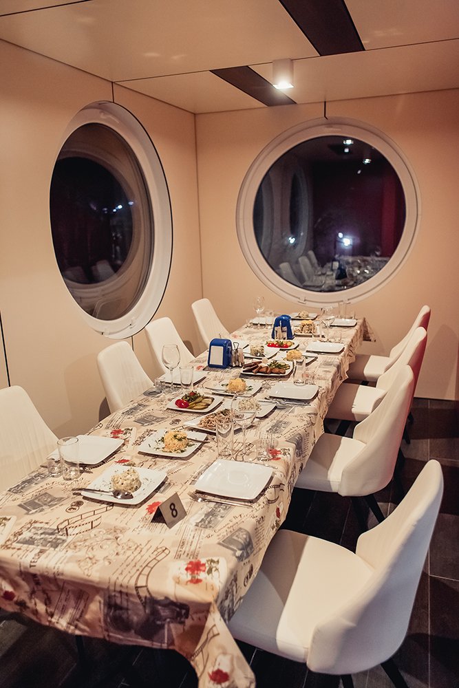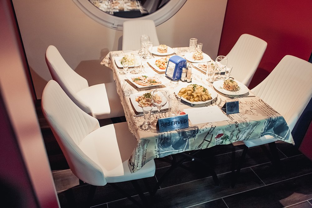 Мебель в ресторане-баре также под стать стенам — современная, интересная, а главное — удобная. Белые мягкие стулья красиво контрастируют на фоне ярких стен, и ставят оригинальную точку в законченности дизайна.