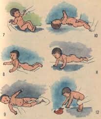 6.Повзання — задіяні всі м'язи тіла,завершення формування кульшових суглобів, узгоджена робота правої та лівої півкуль мозку;
