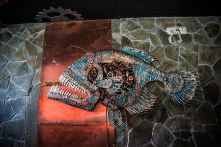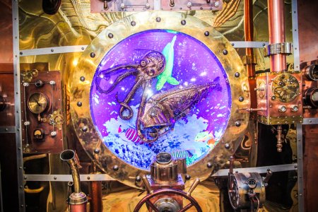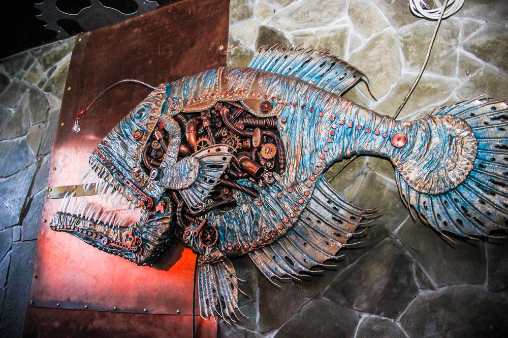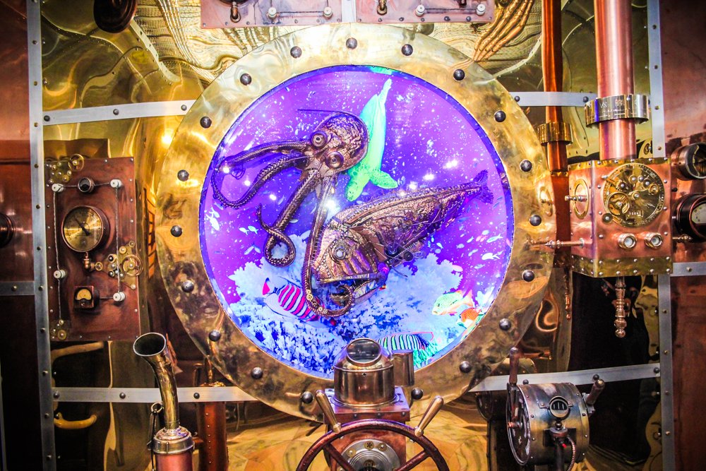 В «Наутилусе» органично сплелись романтика и технический прогресс ХІХ века. «Телепортация» в альтернативную историю начинается уже на входе в заведение. Посетителей встречает двухметровый аквалангист родом из викторианской Англии. Дальше кременчужан и гостей города ожидает погружение на «20 тысяч лье». Для поддержания соответствующей атмосферы в залах полно кинетических произведений искусства, установленных на потолке и стенах бара. Кругом медные элементы, шестеренки, фантастические рыбы и другие механизмы, которые до этого все мы видели разве что в музеях.