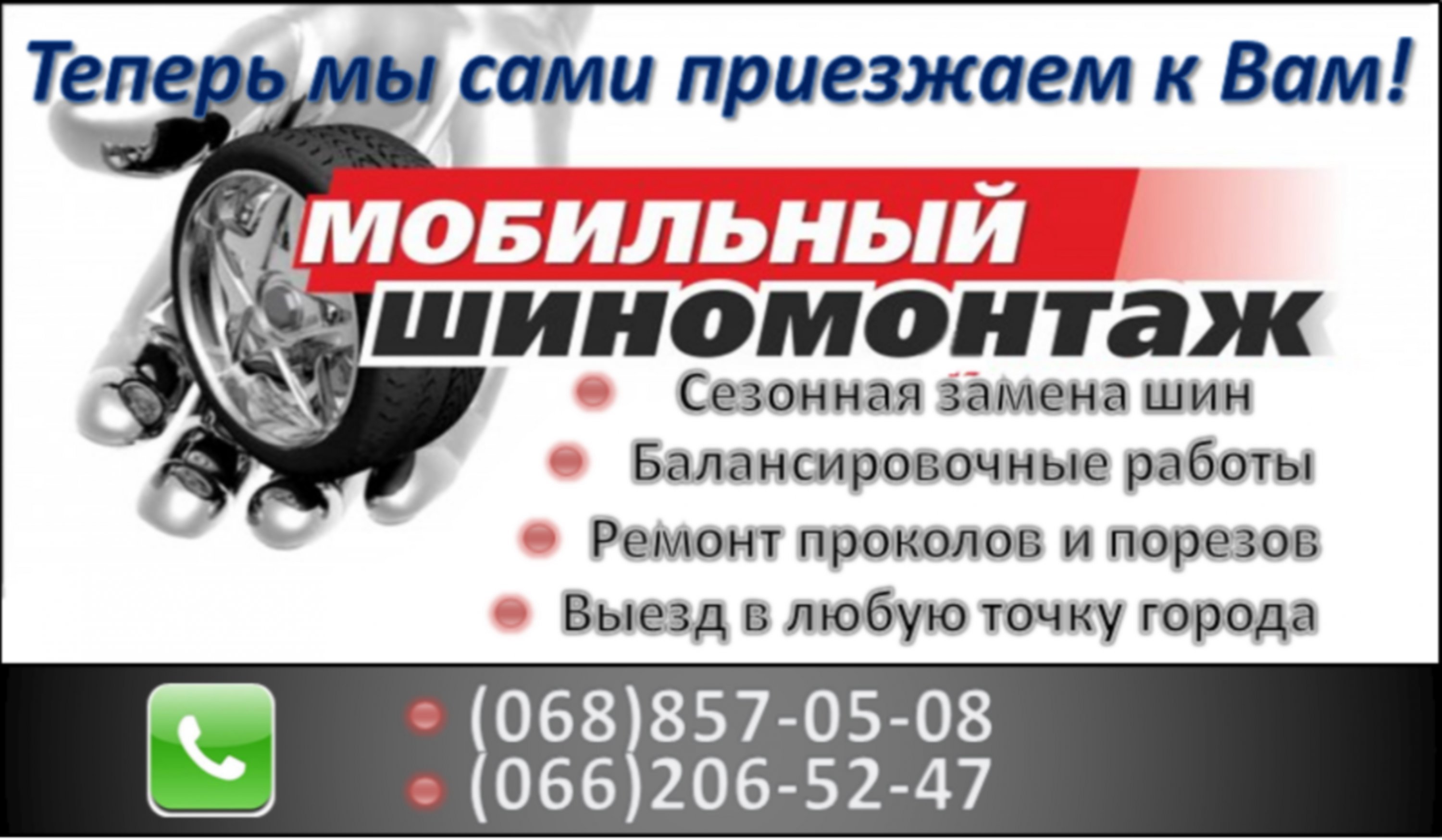 Для того, чтобы вызвать передвижной шиномонтаж, Вам потребуется позвонить нам по телефону (068) 857-05-08 или (066) 206-52-47 и сделать свой заказ. Нашу помощь вы сможете получить в любом районе города. Вне зависимости от того где Вы находитесь, наши специалисты прибудут к вам на помощь.