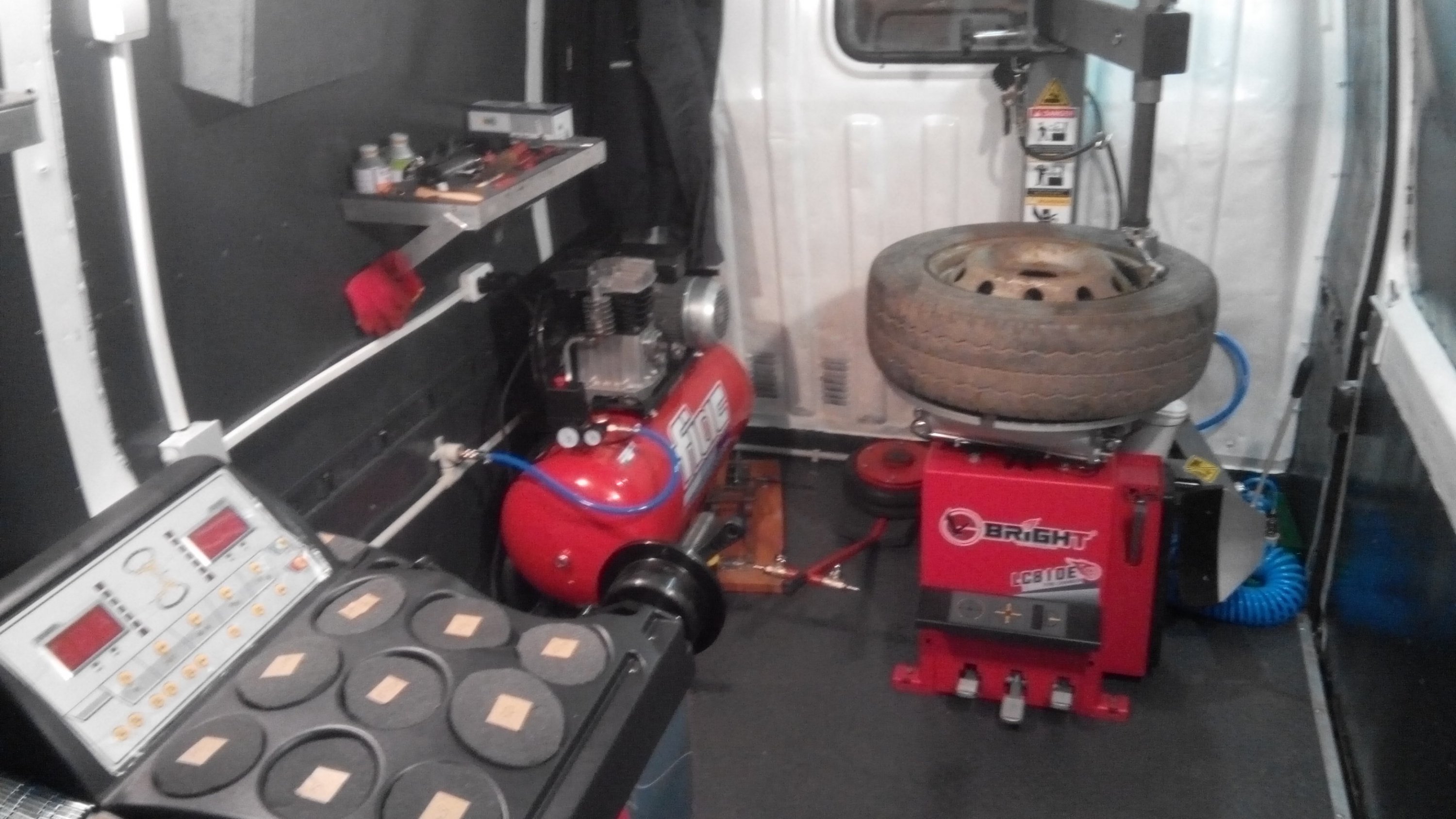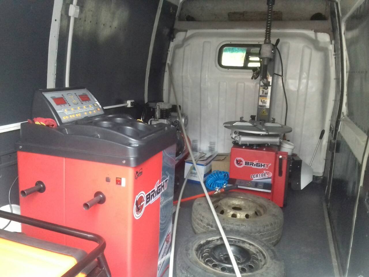 Внутри микроавтобуса есть шиномонтажный станок, который используется для демонтажа и монтажа шин различного размера, как бескамерных, так и камерных.