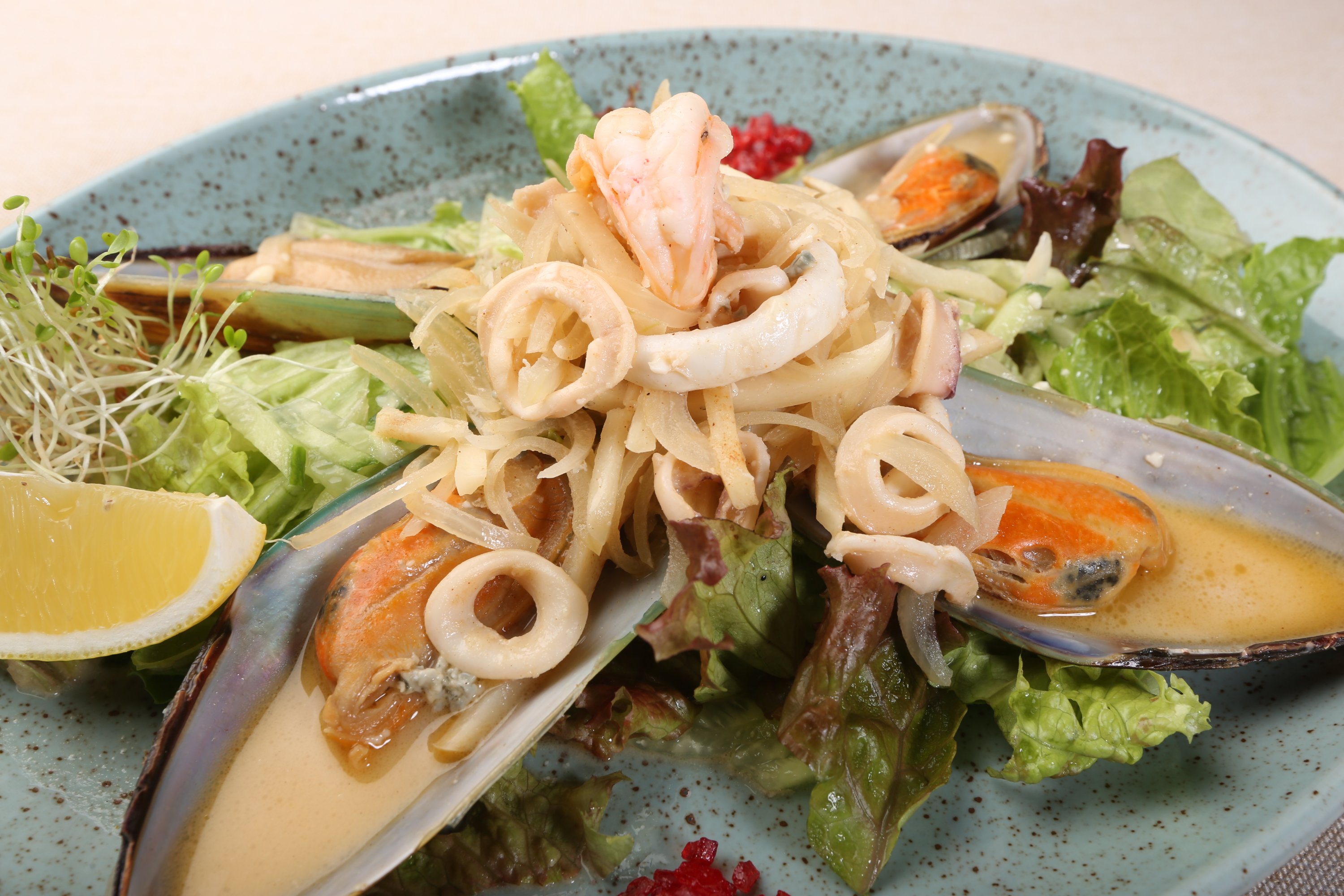 Теплый салат с морепродуктами под заправкой Дор-Блю