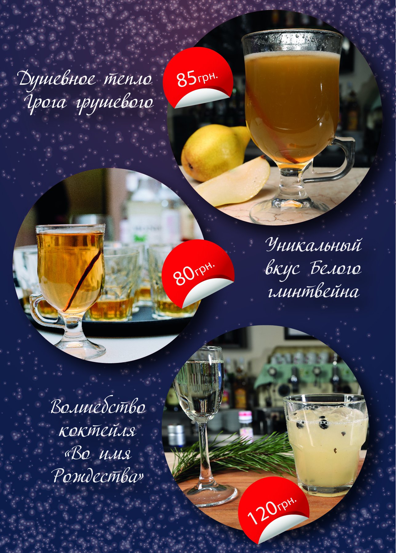 А необычность приятного вкуса Грога грушевого, Грога по-фински и Белого глинтвейна скрыт прямо в их названии. Все это и многое другое, тщательно отбираемое по качеству и вкусу гостя, окажется достойным сопровождением блюд европейской и украинской кухни от нашего виртуозного шеф-повара и его команды профессиональных поваров.