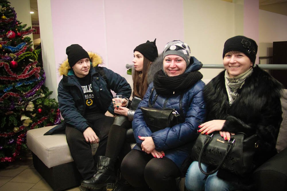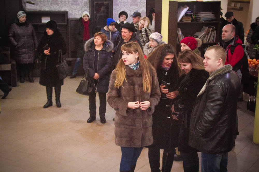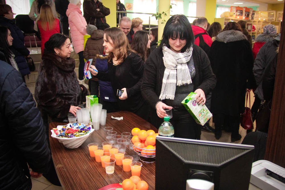 Чтобы посетители не заскучали, для них организовали фуршет: шампанское, сок, фрукты, конфеты. Люди общались и делились впечатлениями о своих покупках.