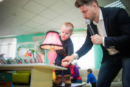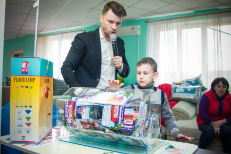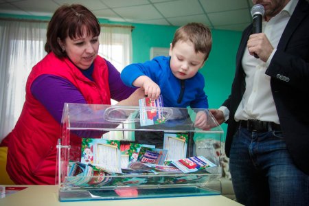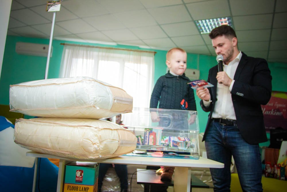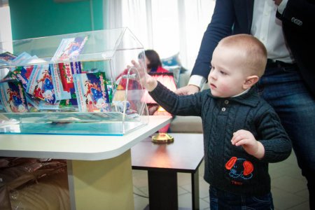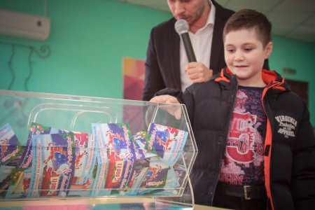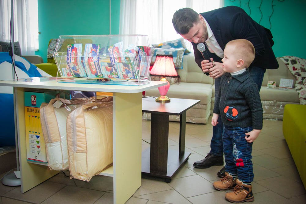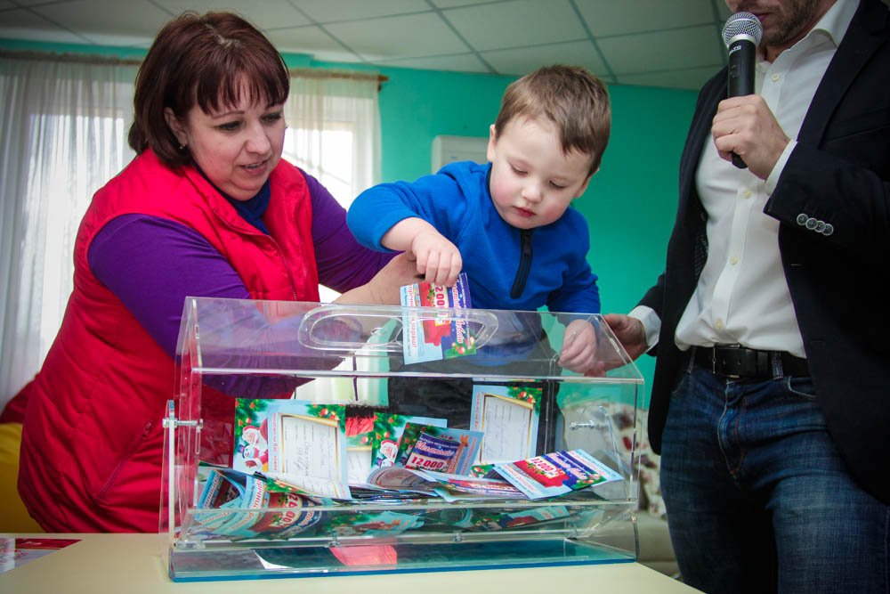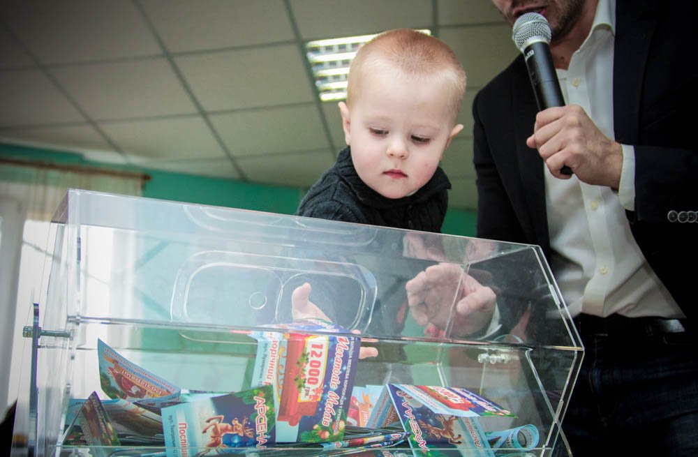 Для того, чтобы розыгрыш прошел честно, доставать билет из лототрона пригласили малышей, которые пришли в магазин Арсенал вместе со своими родителями.