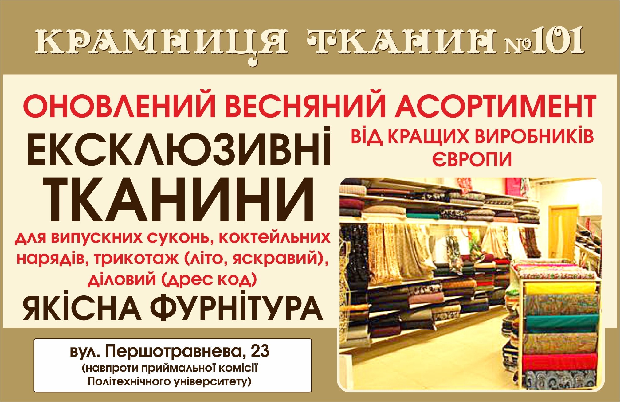 не так давно відкрився новий магазин “Крамниця тканин №101”.На вас чекає оновлений весняний асортимент тканин від найкращих виробників Європи та якісна фурнітура.В нашій крамниці ви придбаєте ексклюзивні тканини для випускних суконь,