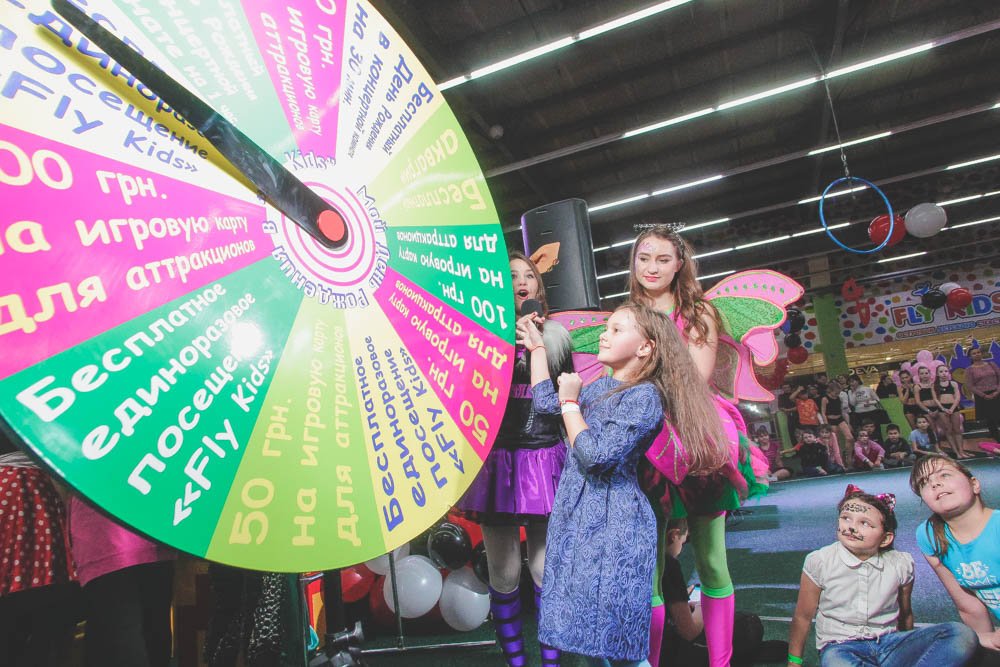 Среди призов «Колесо удачи» - 200 грн./100 грн./ 50 грн. на игровую карту аттракционов, бесплатное единое посещение Fly Kids, бесплатный аквагрим, бесплатный День рождения на 30 минут/1 час в концертной комнате.