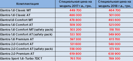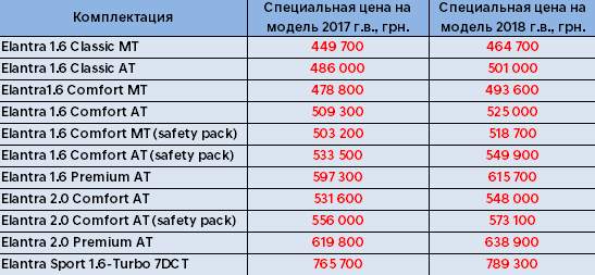 Мировой бестселлер марки Hyundai 2017 года, стильный бизнес-седан Elantra теперь можно приобрести в Украине по невероятно выгодным ценам. Автомобиль доступен в четырех комплектациях, оснащается бензиновыми двигателями объемом 1.6 и 2.0 литра на выбор, которые работают в паре с 6-скоростными механической и автоматической коробками передач. Также специальные цены установлены на «заряженную» версию Elantra Sport, которая оснащается 200-сильным 1.6 литровым бензиновым мотором, взаимодействующим с 7-диапазонной роботизированной трансмиссией с двойным сцеплением.