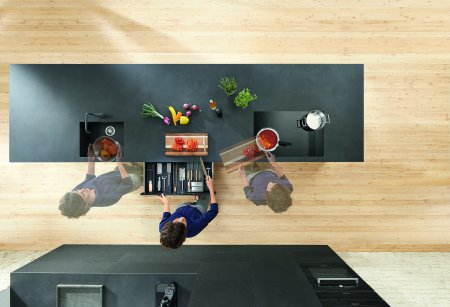 Посудомоечная машина в свою очередь должна располагаться рядом с мойкой, так как перед тем, как загрузить посуду, необходимо очистить её от остатков еды. И важно, что «правша» при этом держит посуду в левой руке и щётку в правой, а «левша», наоборот. Поэтому для «правши» посудомоечная машина должна располагаться слева от мойки, для «левши» - справа. Кстати, если мойка не оборудована измельчителем пищевых отходов, при угловом расположении мебели она не должна взаимно блокировать посудомоечную машину.