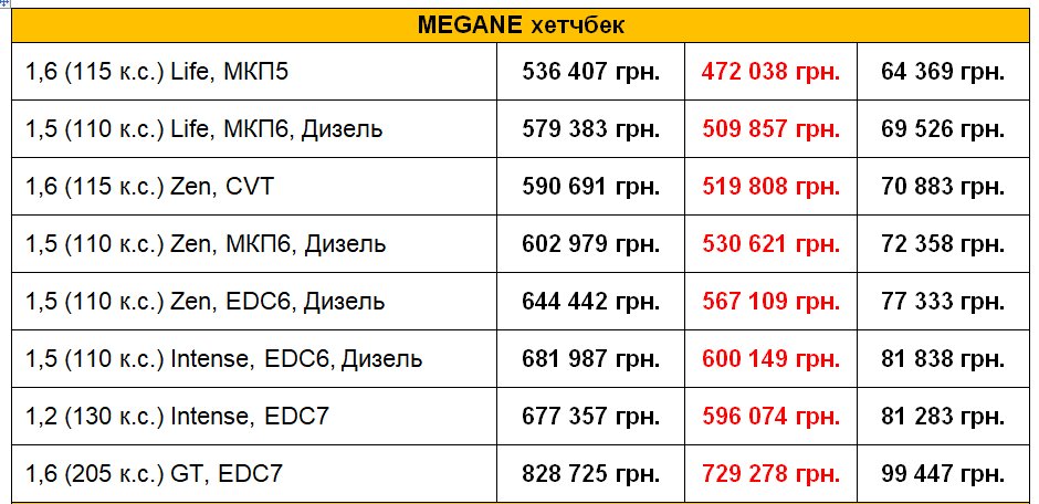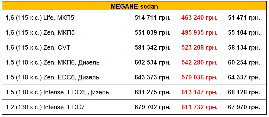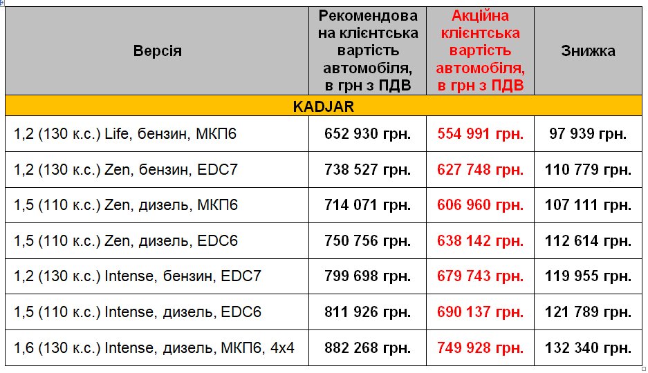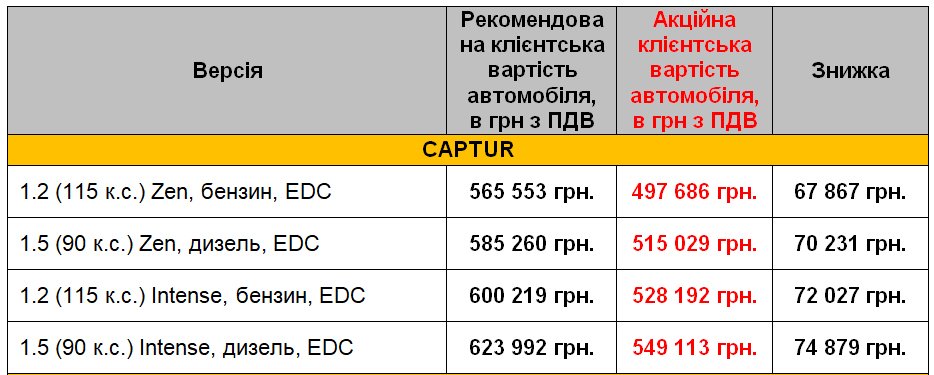 В період дії спеціальної пропозиції на обмежену партію автомобілів*діє знижка надинамічний кросовер Renault Kadjar, яка становить 15%. На акційних умовах стильний кросовер Renault Captur можна придбати за ціною, зниженою на 12%. Спеціальна пропозиція також діє на маневрений і технологічний Renault Megane хетчбек, який можна придбати зі знижкою 12%. А легендарний седан Renault Megane має більш привабливу ціну за рахунок 10% знижки.