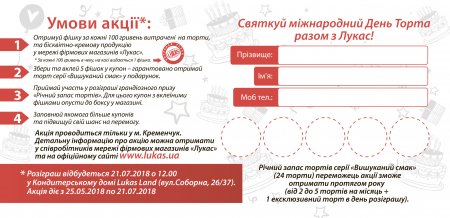 Умови акції дуже прості: купуйте торт, або бісквітно-кремову продукцію у фірмових магазинах “Лукас”.