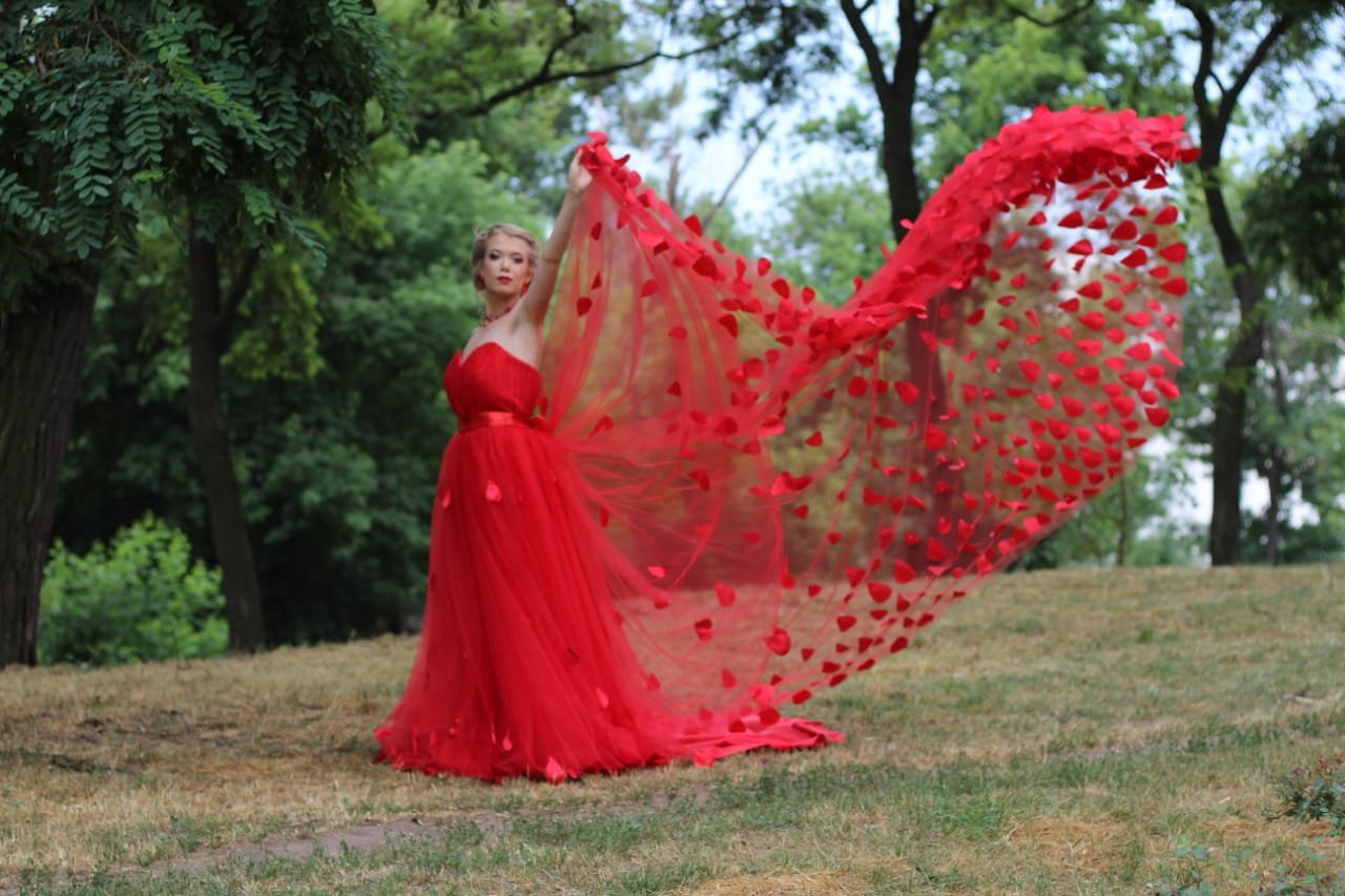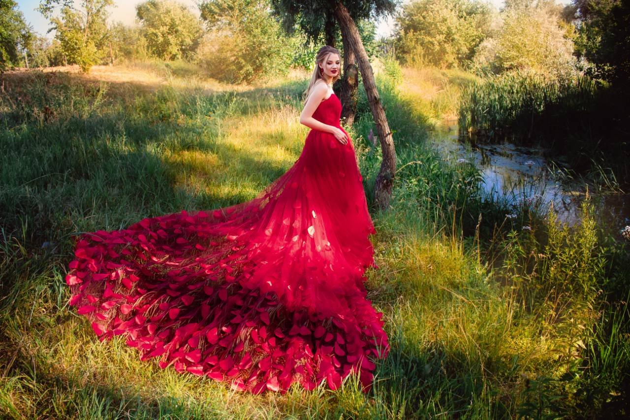 с длинным шлейфом из роз заставит почувствовать себя на седьмом небе от счастья.