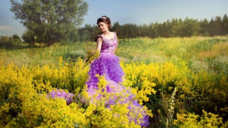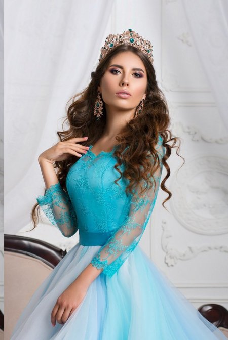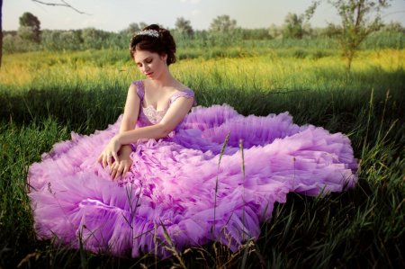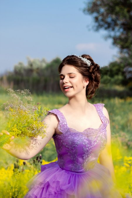 Лилового цвета с двухметровым шлейфом и расшитым карсетом украсит как блондинку так и брюнетка. Есть детское платье