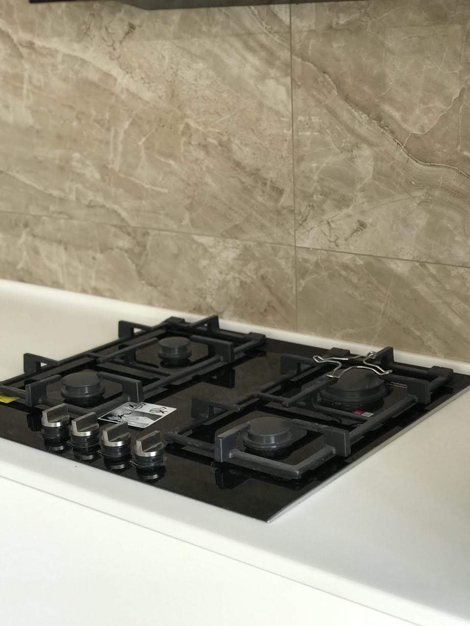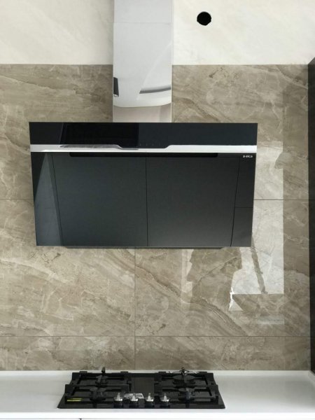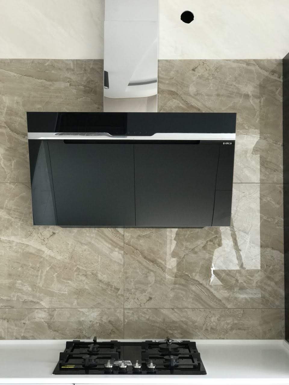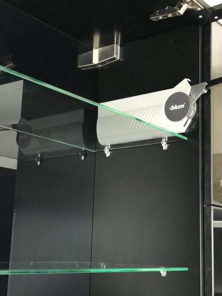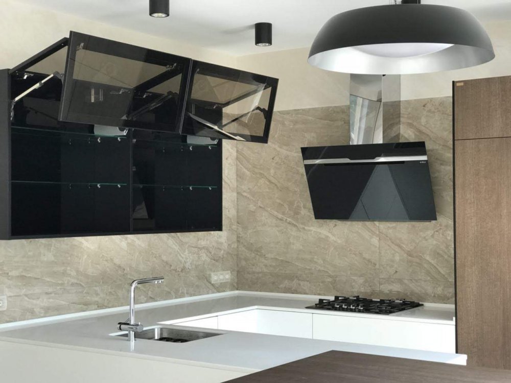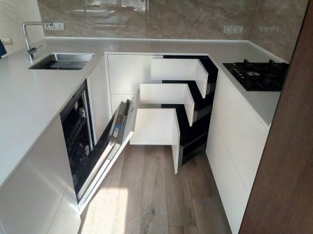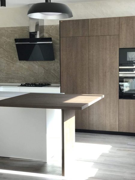 У этой кухни нет ручек, так как они усложняют уход за фасадами. Все выдвижные ящики открываются от нажатия и закрываются с доводчиком. А холодильная с морозильной камеры и посудомоечная машина открываются с помощью электропривода, который Вы можете увидеть в нашем салоне по Победы 4.